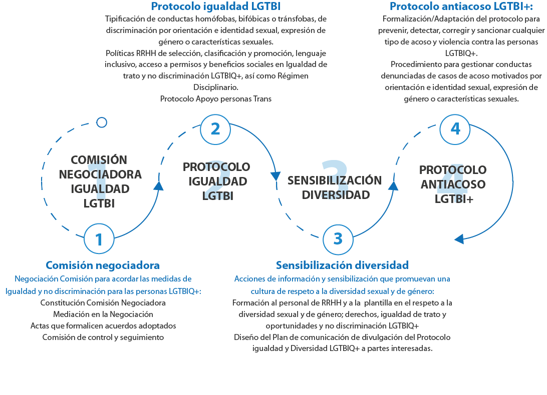- Planes de formación que incluirán módulos específicos sobre los derechos de las personas LGTBI en el trabajo, con especial incidencia en la igualdad de trato y en la no discriminación.